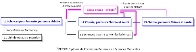Le parcours « Chimie et santé » (L2 et L3) se place dans la continuité de la L1 Sciences pour la santé, parcours chimie et vise en premier lieu l’accès aux études de santé. L’étudiant engagé dans ce parcours a toutefois la possibilité de se spécialiser progressivement en chimie en cas de modification de son projet d’études. Les 2ème et 3ème années de ce parcours ne sont accessibles qu’aux étudiants ayant validé une L1 Sciences pour la santé de l’Université de Strasbourg.