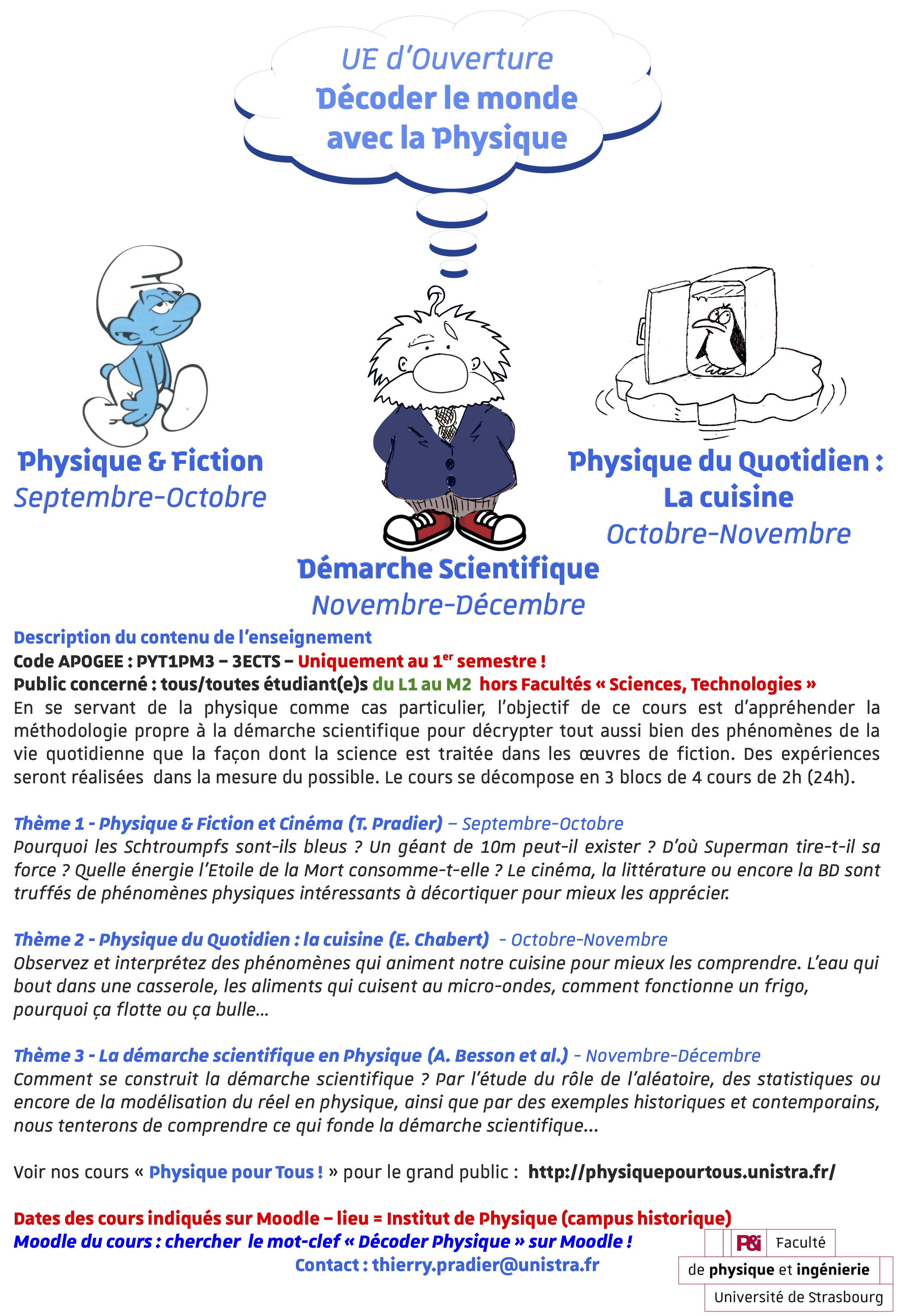 - Pour 2025-26, 1er cours le lundi 22/09/2024 17h30 Amphis Fresnel, Institut de Physique [selon le jour] - voir le moodle du cours en cherchant le mot-clef "Décoder Physique", pour les dates exactes ou ici : https://moodle.unistra.fr/course/view.php?id=6862